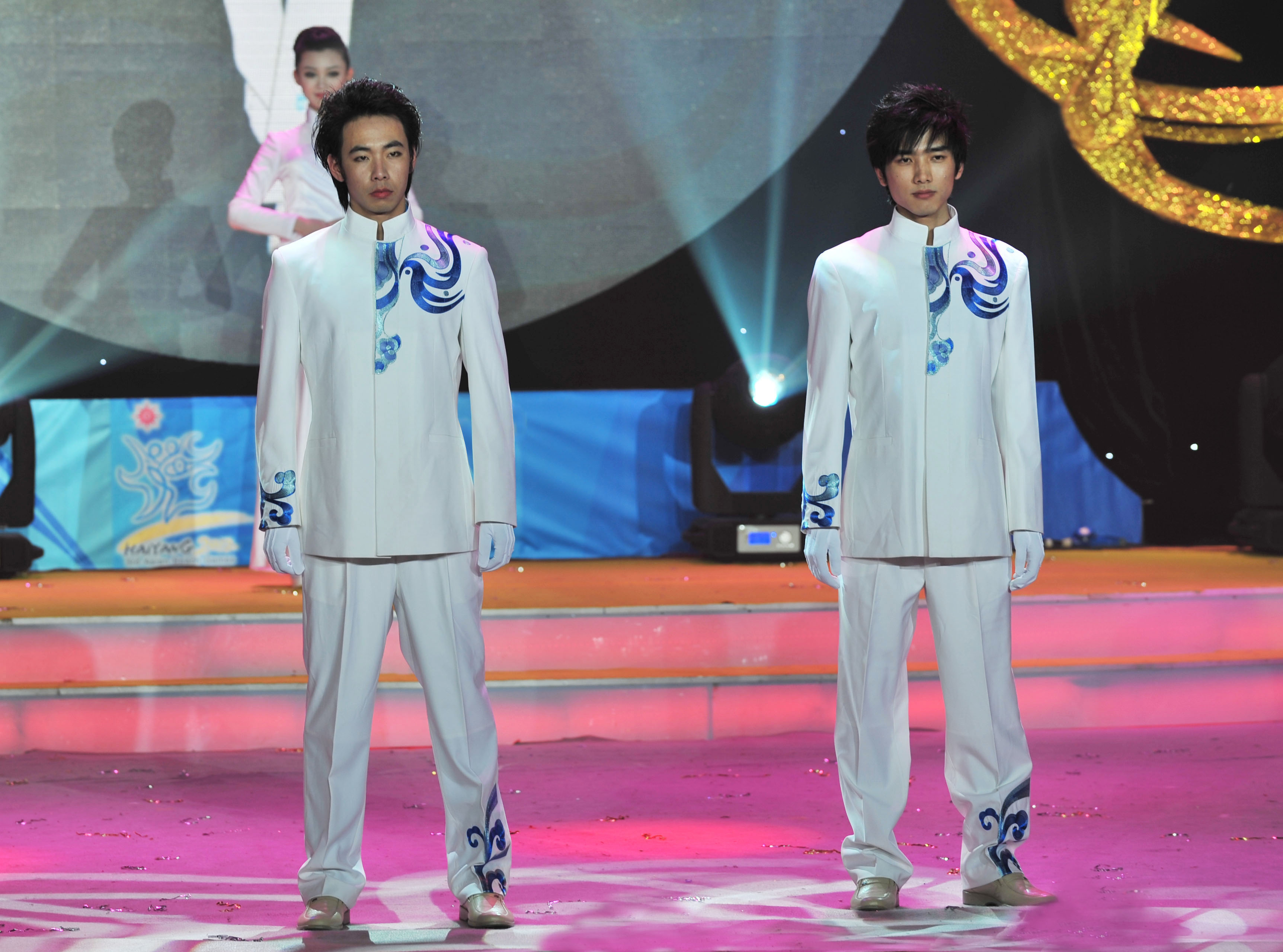 “海韵阳光”篇——亚沙会升旗手设计手法与礼仪服相呼应,浪花与凤凰是用金属线剌绣,前胸的如意贴布绣使服装更有层次感,打破以往的平面绣花的效果。使海浪的感觉更加活灵活现,选用进口纯白的聚酯纤维面料精制而成,体现升旗手翩翩的风度、阳光时尚的独特魁力。