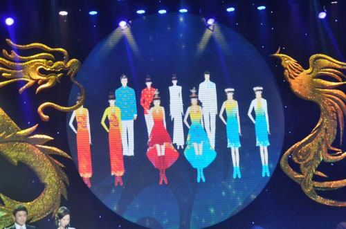 “海韵阳光”篇——亚沙会颁奖礼仪是沙滩黄过渡到海阳蓝的针织礼服,高耸而微微张开的领型,有如含苞待放的花朵,大气而不张扬。用海天接壤的天蓝色与白色勾勒出浪花图案分布在前胸与裙摆,结合若隐若现的凤凰图案,仿如一幅脱俗的海境,搭配头上的橄榄枝花环,凤凰纹样的小短靴体现颁奖礼仪小姐清新而充满活力的形象。服装的面料是选用高级超密进口弹力针织面料光泽亮丽而垂感好。适合6月份的海阳天气,我们设计增加了贴身小外方便穿脱。